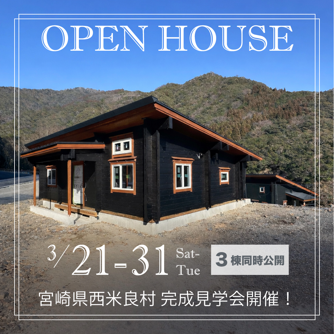 温泉付きプライベートヴィラのログハウス完成見学会を開催します。 平屋2棟と、2階建てロフトタイプ1棟の計3棟を同時公開。 それぞれ間取りや空間構成、実際のボリューム感や仕様の違いをご確認いただけます。 本物件は国産の杉ログを使用したログハウス。 木の質感や香りもぜひお確かめください。 別荘利用をご検討の方や、宿泊事業の展開をお考えの方にも、具体的なイメージを持っていただける見学会です。