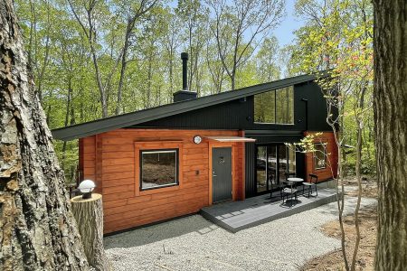 妻壁に大きな開口が特徴的で、周りの緑や山々などの自然が一望できる請託なログハウスです。